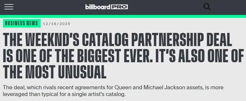 威肯的唱片目录合作协议是有史以来规模最大的协议之一,也是最不寻常的协议之一 《公告牌》称,此次协议的达成,不仅是少数几笔估值达10亿美元的艺人收购案之一,而且它可能是艺人音乐资产交易史上杠杆率最高的交易之一。