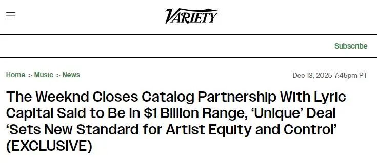 据《综艺》《公告牌》和彭博社此前报道,威肯音乐版权库估值至少为10亿美元,这其中唱片公司和出版商的净分成约为5500万美元。