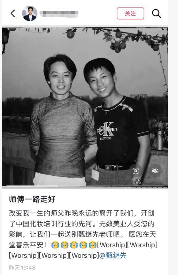 这位网友在文中写道:“改变我一生的师父昨晚永远的离开了我们,开创了中国化妆培训行业的先河,无数美业人受您的影响,让我们一起送别甄继先老师吧,愿您在天堂喜乐平安。”