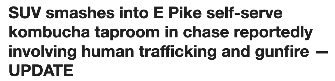 周一(15日)凌晨,西雅图国会山地区突发惊险一幕。位于东匹克街700街区的SOMA Kombucha自选康普茶店,被一辆SUV高速撞入,整面玻璃墙瞬间破碎,店内一片狼藉。