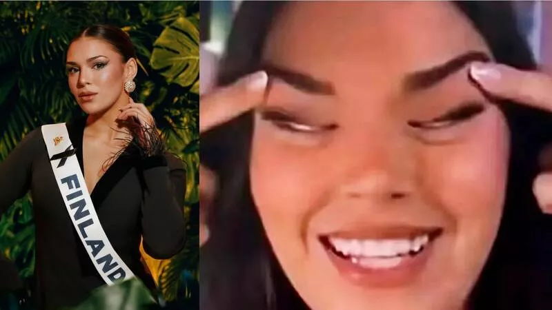 刚夺下“芬兰小姐”后冠的札法切(左),因在社群媒体发布一张做出“拉眼角”手势的照片(右)引发种族歧视争议。 (图取自X平台)