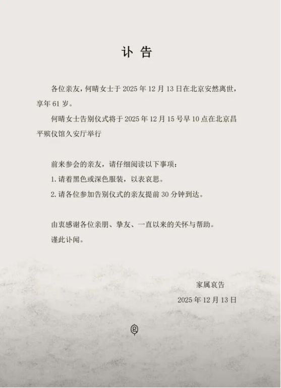 12月13日,演员何晴的家属发布讣告:“各位亲友,何晴女士于2025年12月13日在北京安然离世,享年61岁。何晴女士告别仪式将于2025年12月15号早10点在北京昌平殡仪馆久安厅举行。”