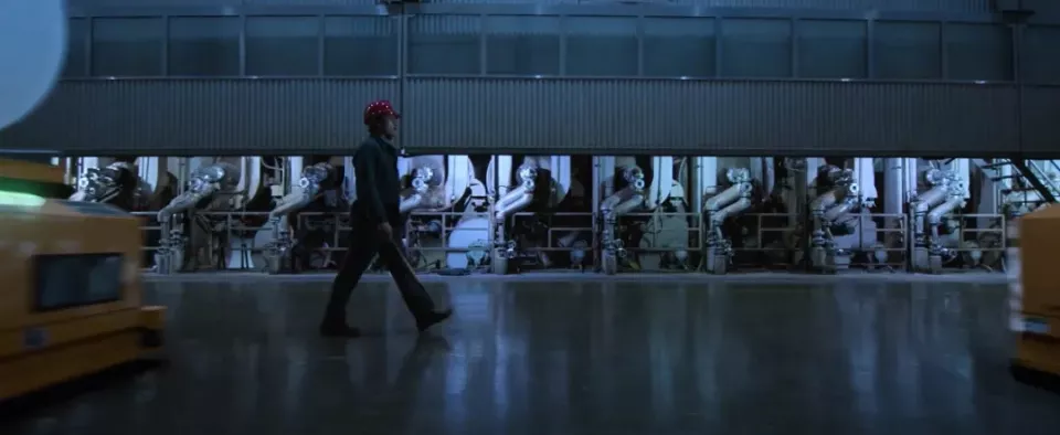 其中有一幕是机械臂正有节奏地敲击纸卷,万秀按照习惯也拿着工具敲击,但实际上这个动作完全是多余的,机器已经替代了他。他用尽一切手段,背叛了同行,背叛了良知,最终换来的,是一个在AI和机器面前完全无用的职位。