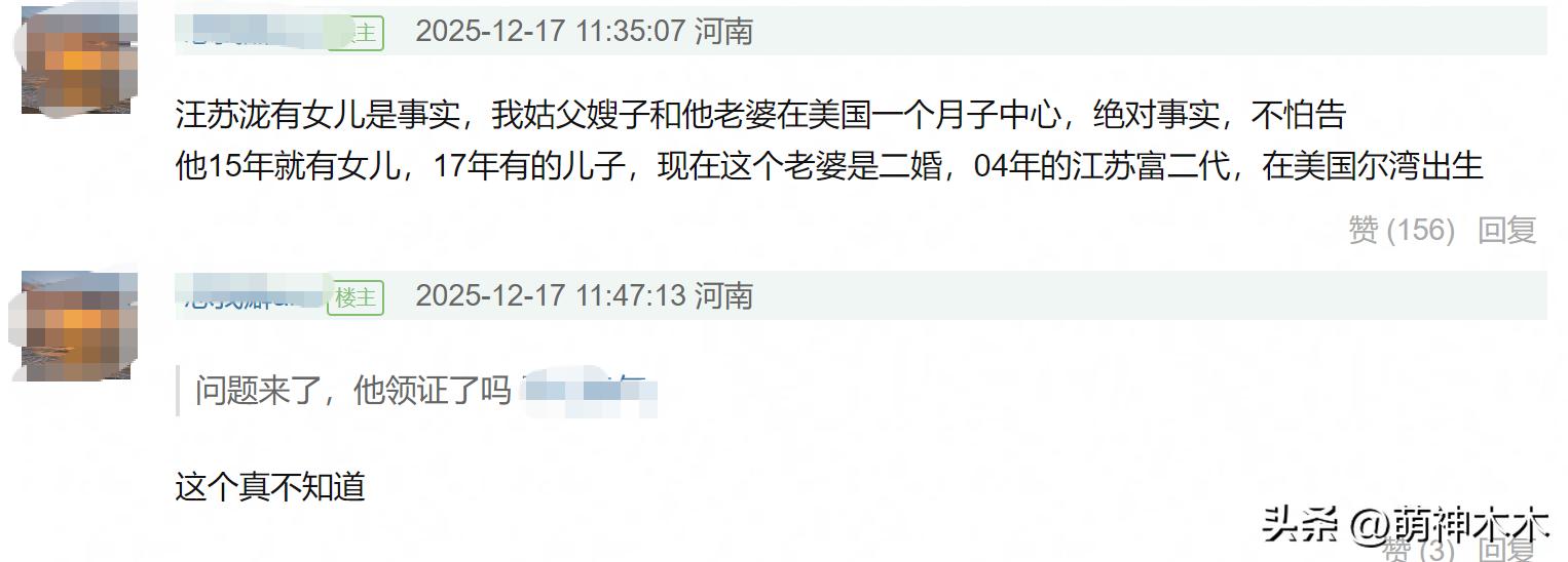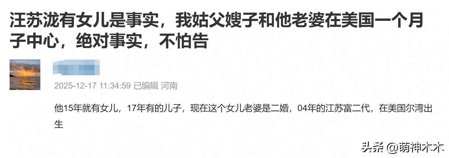12月17日,有网友发帖爆料称,汪苏泷有女儿是事实。称其2015年就有了女儿,2017年还生了儿子,现在这个老婆是二婚,2004年出生的江苏富二代,孩子在美国出生。