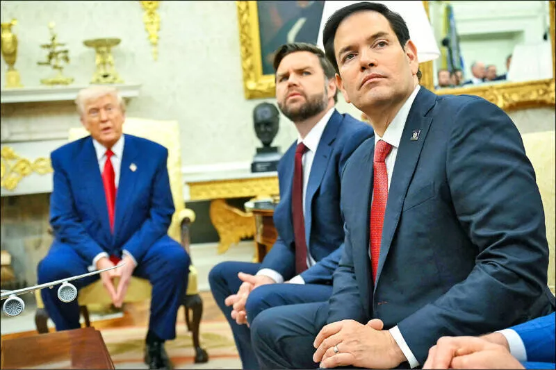 如果2028年美国总统大选共和党内出现竞争,美国国务卿卢比奥(图右)近日受访表示,只要副总统万斯(图中)争取提名,就不会上场与他竞争。(法新社档案照)