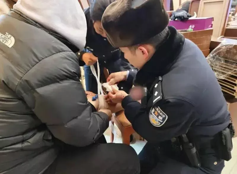附近巡逻的女民警迅速上前帮忙,先把男游客移动到附近温暖的店家,待急救箱送达后,先把外裤剪开,积压的鲜血又喷涌而出,女警也急忙按压止血,等待救护车赶来,也一直强调要“在东北出门必须穿棉裤”。