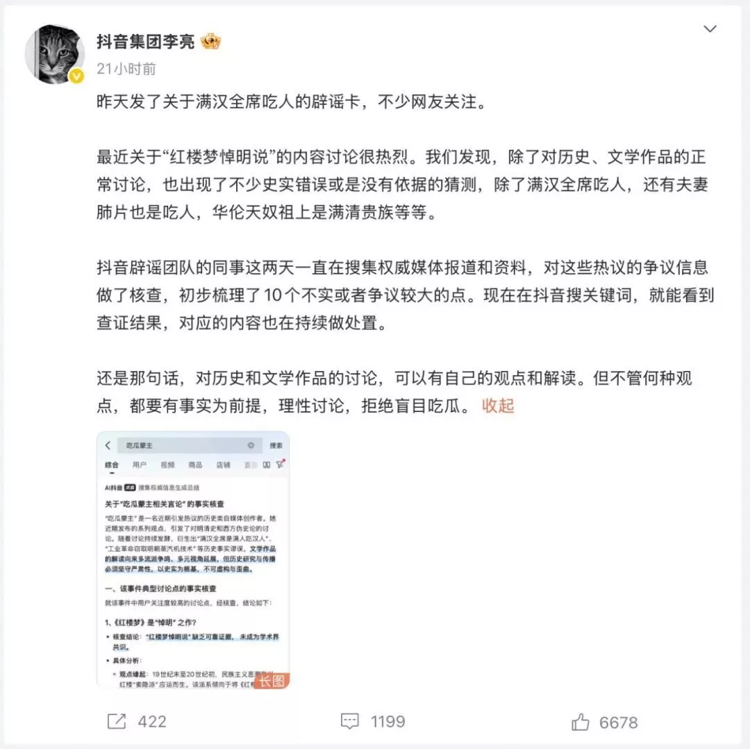 李亮这次是很狼狈的。作为平台高管,平时都是在科技峰会上谈笑风生,现在却要被迫在微博上科普“红楼梦不是悼明之作”、“满汉全席不是吃人”。