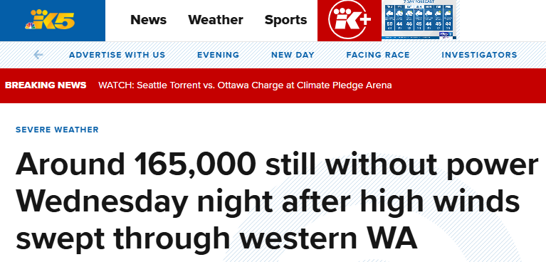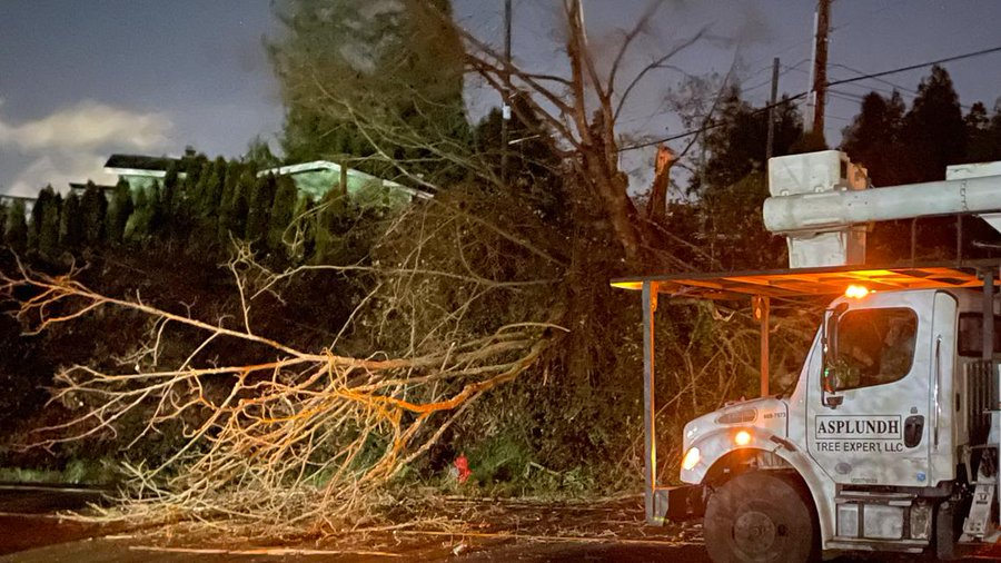 据报道,一场夜间强风横扫华盛顿州西部地区,刮倒大量树木、树枝及电线,致使周三(17日)早上超24.5万户遭遇断电。随着电力抢修工作的持续推进,断电用户数量已降至约16.5万。