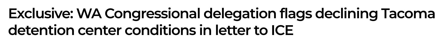 近日,华盛顿州多名国会议员联名致信美国移民与海关执法局ICE,严厉批评塔科马西北移民拘留中心拘留条件持续恶化,要求联邦政府立即采取整改措施。直指现状“完全不可接受”,并强调ICE及联邦政府“对被拘留者负有基本的道德与法律责任”。