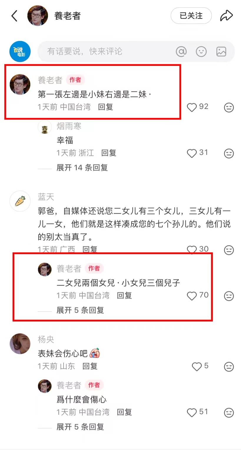 三个女儿都很混血,郭爸爸告诉大家,左边是小妹,右边是二妹,二妹和郭碧婷很像,目前在湾湾坐月子,她老公在加拿大(专题)工作,所以生完孩子他们就回加拿大生活。二妹有两个女儿,大女儿叫妮妮。小女儿生了三个儿子,所以加上郭碧婷的一双儿女,郭爸爸就有七个孙子孙女,当然也叫外孙外孙女,其实没有太大的区别。