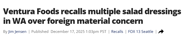 Ventura Foods公司目前正在召回多款沙拉酱产品,原因是这些产品所使用的洋葱碎中被发现含有黑色塑料种植材料。