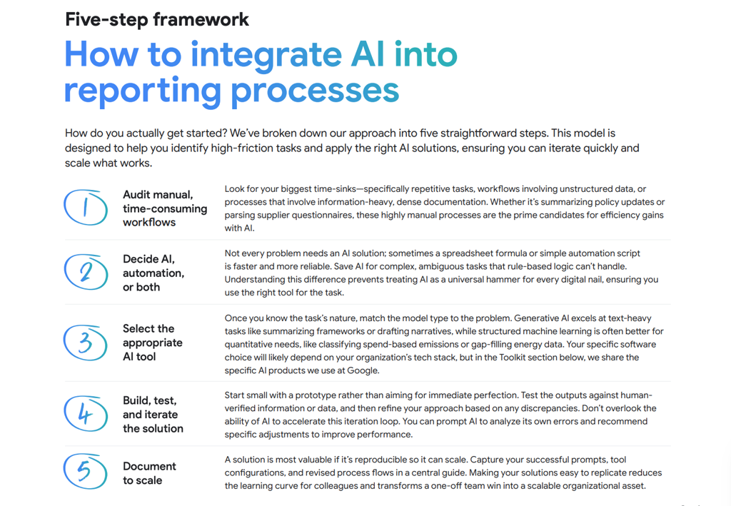 在全球企业永续揭露压力快速升高之际,科技巨头 Google近日宣布对外公开其内部运行2年的 AI 永续报告方法,正式推出《AI 永续报告实战手册》(AI Playbook for Sustainability Reporting)。手册并非概念性白皮书,而是源自 Google实务经验的操作指南,以结构化框架与实际工具,解决企业长期面临的 ESG资料零散、流程繁琐与审核负荷过重等痛点。