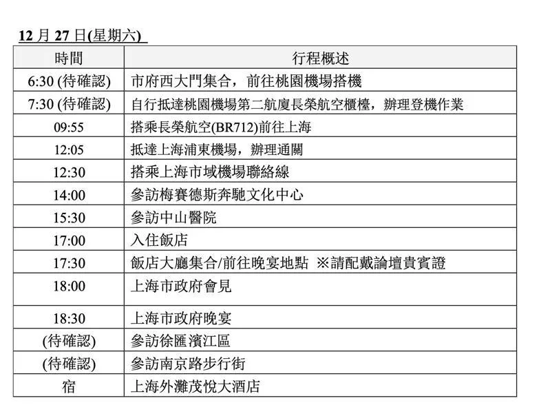 双城论坛将在下周末登场,议员曾献莹今天也揭露双城论坛的行程,总共预计两天,第一天主要已参访为主,包含参访梅赛德斯奔驰文化中心、中山医院下午入住饭店,并与上海市政府会见后参加晚宴。