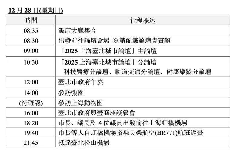 在两个论坛结束后,由台北市政府宴请午宴,接着参访市中心的历史文化街区张园及将交换小猫熊的上海动物园,接着与台商座谈餐会后,蒋万安等人将前往机场返台。