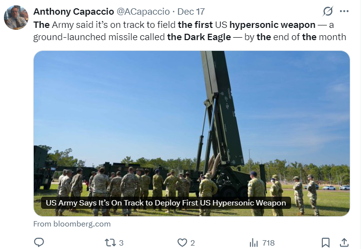美国有望月底部署首款高超音速武器彭博社