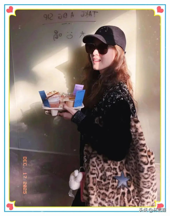 照片中,她坐在户外,手里捧着几杯咖啡,似乎是刚和朋友聚会结束,眼神轻松,笑意藏在嘴角。