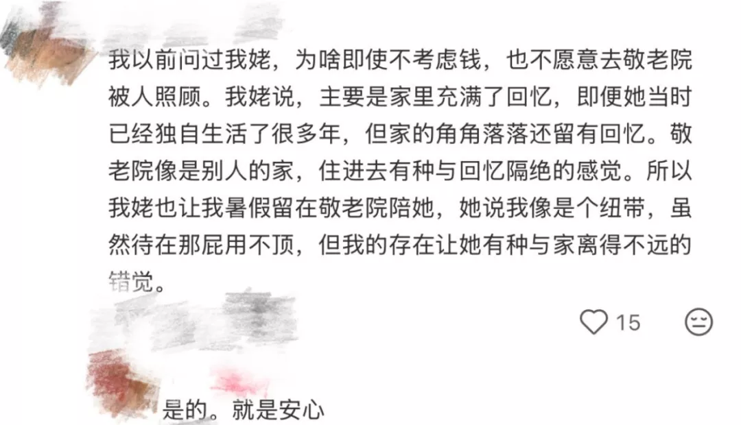 同样陪奶奶住养老院的@天气晴,也提到后续如果养老院生意好了,自己是需要退房的,不然耽误养老院做生意,她也会觉得不好意思。