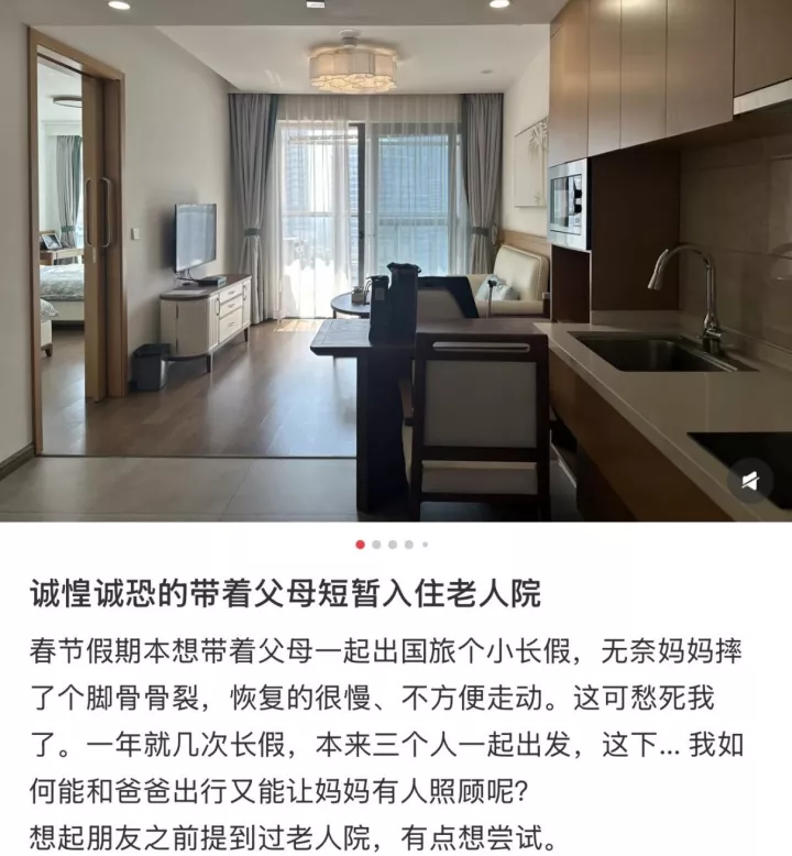 有人在春节假期想和父母一起出国旅行时,忽然遇到了妈妈摔伤的意外情况,想要既和爸爸出行,又能有人照顾妈妈的情况下,选择一家三口暂时住进养老院。
