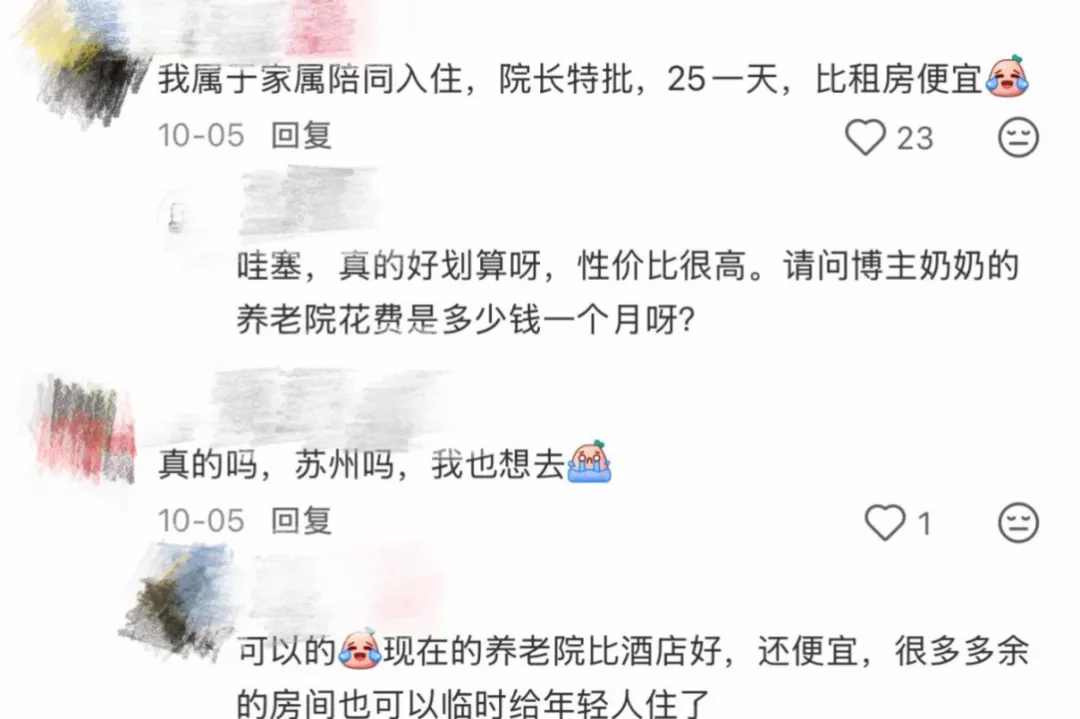 原来,小蒋的奶奶是第一批入住的老人,每个月的入住费用是2500元,小蒋作为家属,每月的1500元其实是亲情优惠价。但因为这家养老院是新开的,空房比较多,所以在小蒋的帖子走红后,养老院愿意以同样1500元的价格来接收年轻人入住,但优先考虑的是工作稳定、性格安静的年轻人。