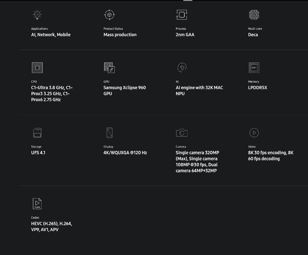 Exynos 2600 AI能力亦显著增强。芯片内置32K MAC NPU,相较上一代Exynos 2500,AI算力提升高达113%。三星还计划在影像系统中引入ISP AI算法,以优化图像识别、降噪与色彩还原。此外,Exynos 2600支持最高3.2亿像素摄像头,满足高端移动摄影需求。
