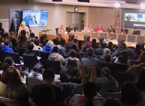 旧金山联合学区学区教育委员会17日晚间举行的会议吸引大批民众到场,会场内座无虚席,场外亦有家长、教师与学生集结高喊口号,表达反对削减预算的立场。多位与会者手持标语,要求学区以学生为优先,现场公众发言一度情绪激动。