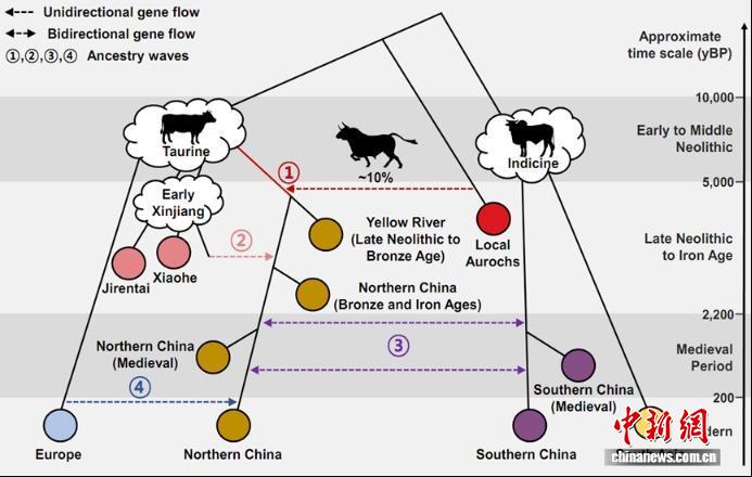 研究表明,距今约5000年前的新石器时代晚期,普通牛(Bos taurine)传入黄河流域并与本土野生原牛发生基因交流;新疆地区的早期家牛受到西亚普通牛和南亚瘤牛(Bos indicus)的共同影响,自青铜时代晚期至铁器时代不断向黄河流域渗透,持续影响了中国北方家牛的遗传结构。铁器时代至明清时期,南北方牛群进一步融合,最终奠定了现今中国南北方家牛的基本遗传框架。