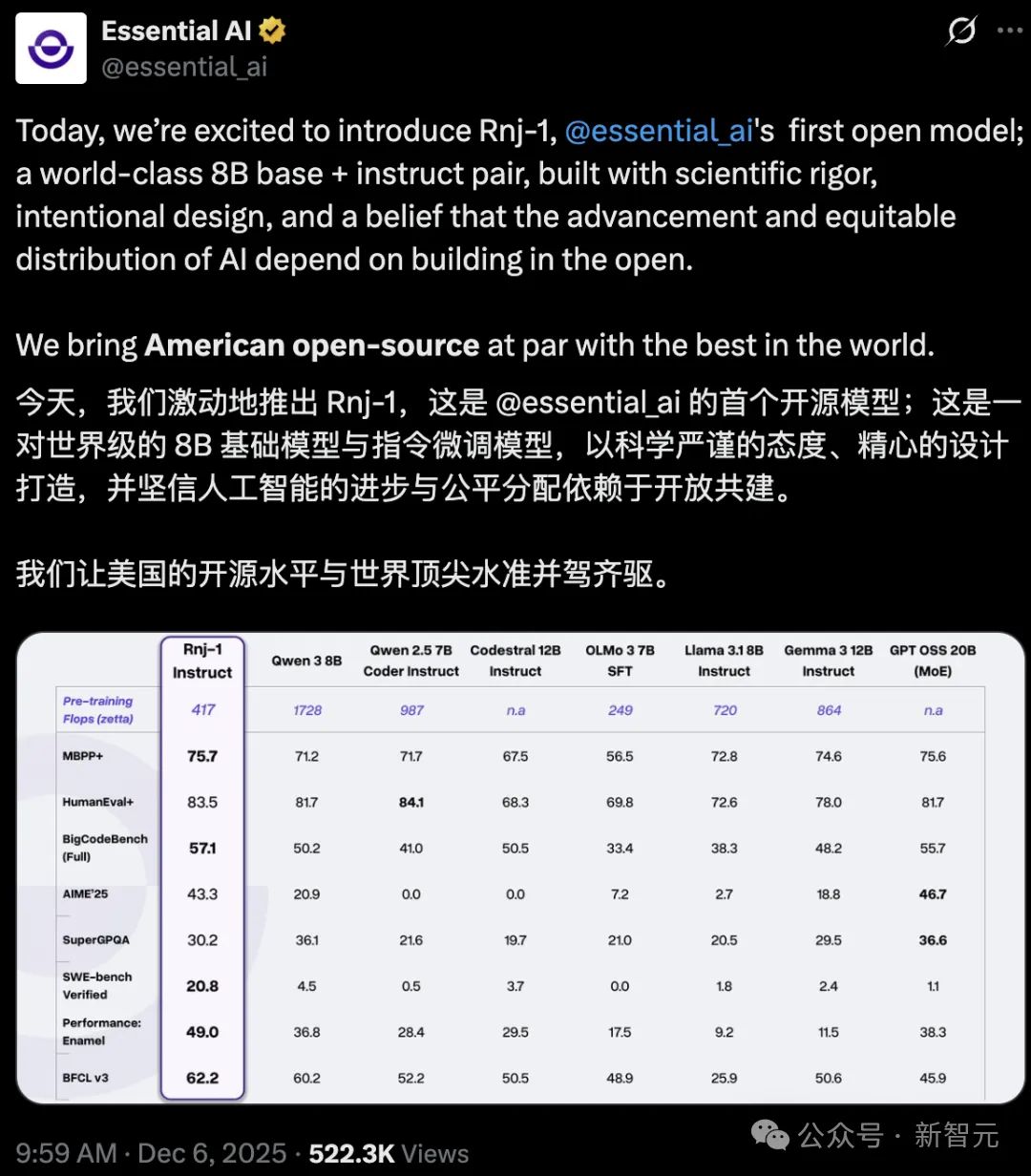 AI不应是巨头游戏,模型也不是越大越聪明。近日,「Transformer八子」中的Ashish Vaswani和Parmar共同推出了一个8B的开源小模型,剑指Scaling Law软肋,为轻量化、开放式AI探索了新方向。 近期,一个80亿参数的「小模型」引发AI圈热议。 这个名为Rnj-1的开源模型,由Ashish Vaswani与Niki Parmar创办的Essential AI Labs推...
