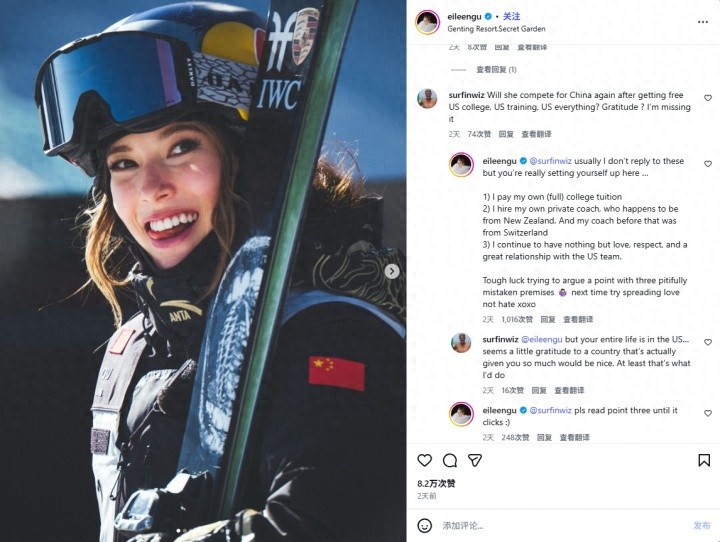 网友回复谷爱凌:但你的整个人生都在美国……对这个给予你如此之多的国家,表达一点感恩之心似乎也无妨。至少我会这么做。