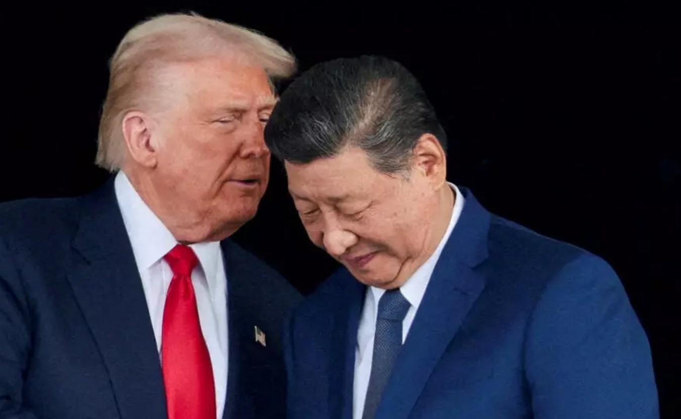 2025年10月30日,在韩国釜山举行的亚太经合组织(APEC)峰会期间,美国总统特朗普与中国国家主席习近平在金海国际机场举行双边会晤后离开时交谈。 REUTERS - Evelyn Hockstein