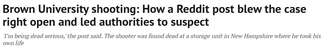 当局周四宣布,涉嫌在布朗大学(Brown University)制造大规模枪击事件、造成2人死亡、多人受伤的男子已被发现死亡。调查取得突破,源于一条线索:调查人员追踪到一则Reddit帖子。