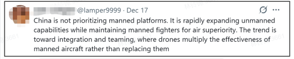 有网友评论说,中国在维持有人战斗机以争夺制空权的同时,也正快速拓展无人作战能力。当前趋势是走向融合与协同,无人机的作用是提升有人机的作战效能,并非取代有人机。