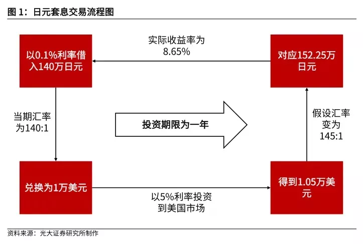 说白了,就是一种简单的理财手段:借入便宜的日元后,兑换成美元,购买收益率更高的美元(5%),从中赚取收益。