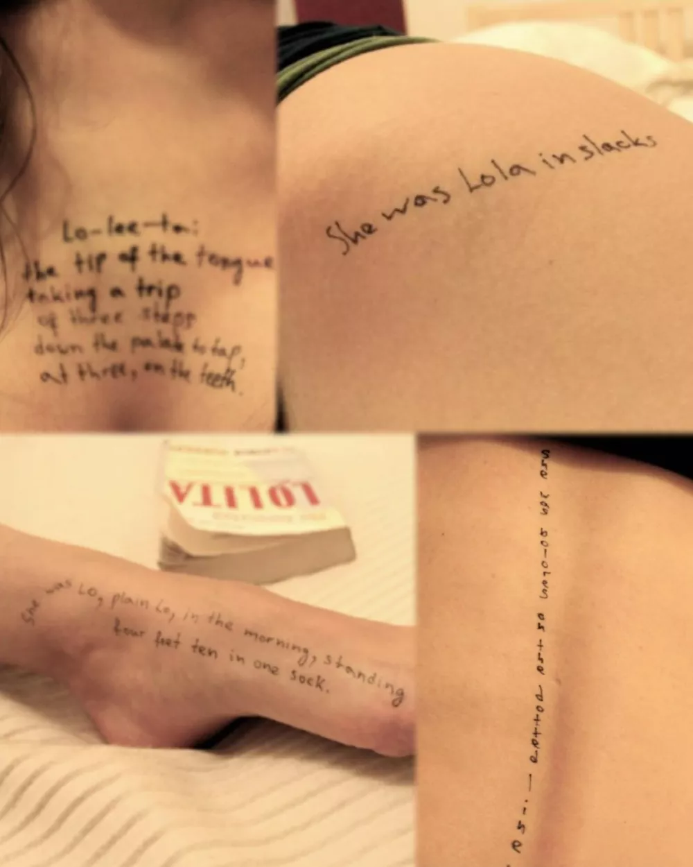有几张照片特别刺眼,拍的是女性的小腿、脚或者后背,上面竟然写着小说《洛丽塔》里的句子,比如“She was Lo, plain Lo…”这种明显带着未成年性暗示的话。