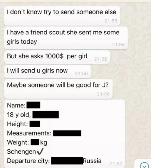 除了这些,照片里还有短信截图,直接写着“送 18 岁俄罗斯女孩,每个 1000 美元”,还附了女孩的身高、出发地这些信息,虽然关键姓名被涂黑了,但明眼人都能看出来,这就是在明码标价招募女孩,说是性贩卖链条的证据都不为过。