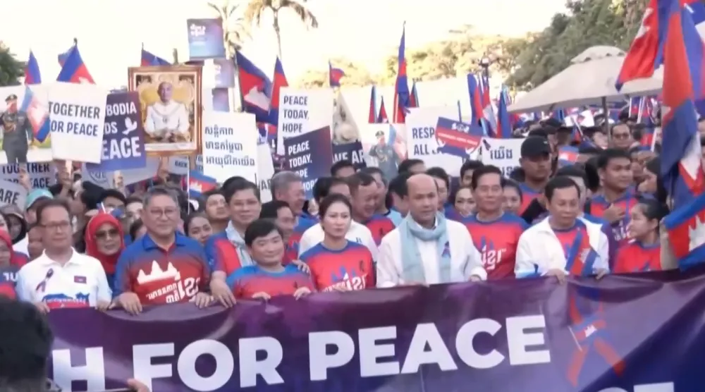 与此同时,柬埔寨副首相洪玛尼和大批民众18日在首都金边举行游行,他们手持国旗,展示和平手势,呼吁结束战争,寻求和平。