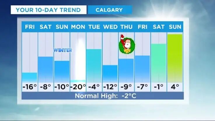这种远低于季节平均的严寒天气将持续至下周一。本周末,一个高压脊将为卡尔加里带来相对稳定但依旧冰冷的天气,以多云间晴为主,伴有零星小雪。简单说:在圣诞节之前,厚羽绒服、雪裤和一切防风装备都还是你的“保命神器”。