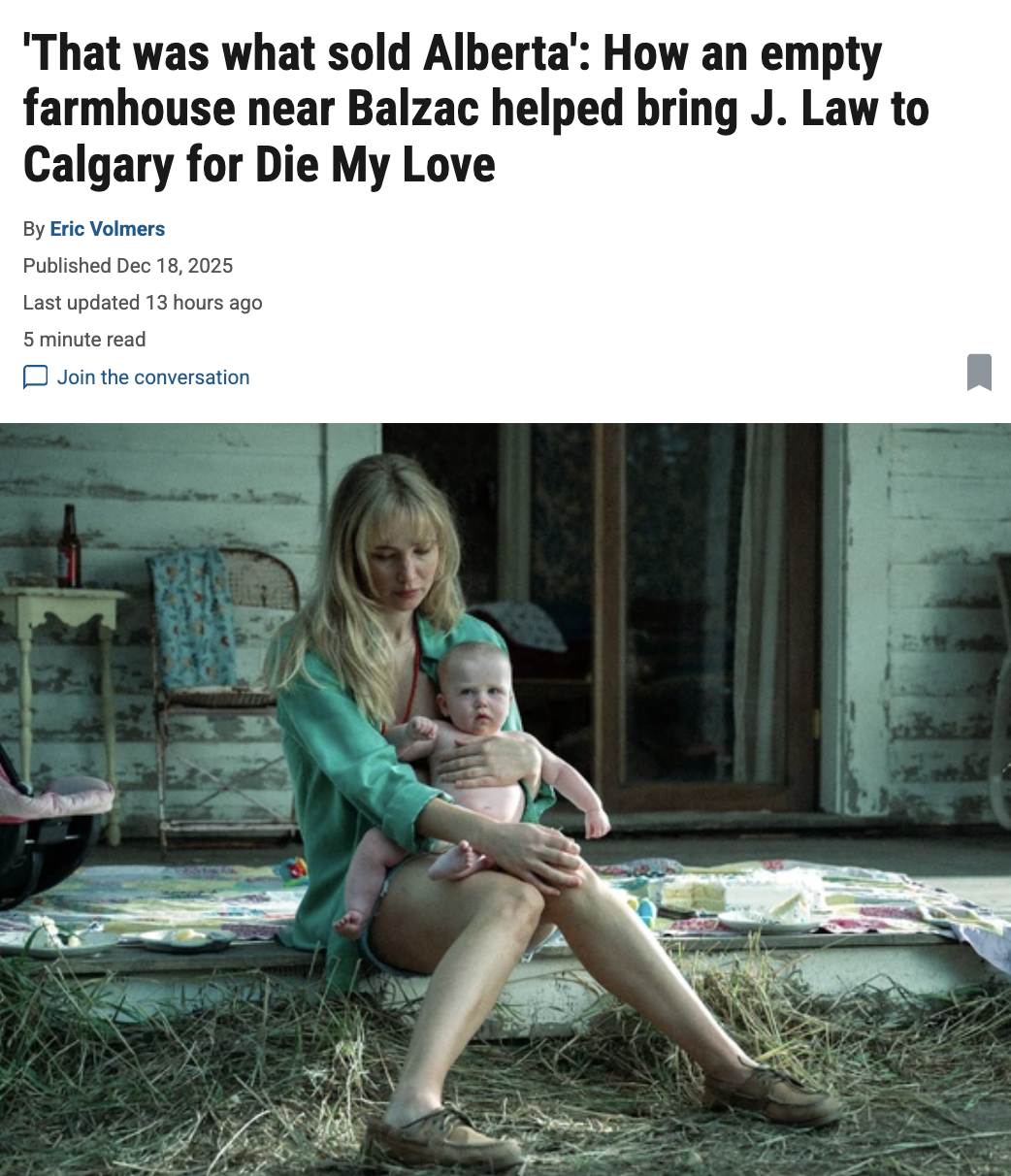 一座位于卡尔加里北部郊区巴尔扎克(Balzac) 的破旧空农舍,竟成为吸引好莱坞顶级制作落地的关键。这座其貌不扬的建筑,凭借独特的氛围,一举击败了美国多州及加拿大数省的众多备选地点,成功“锁定”了由奥斯卡影后詹妮弗·劳伦斯(Jennifer Lawrence) 主演的心理惊悚片《Die My Love》。