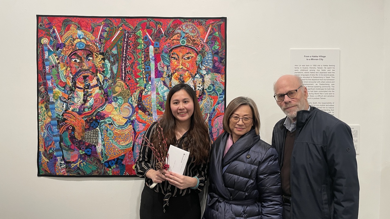 策展人詹子莹(左)表示,展览灵感来源来自她与多个移民来美台湾人对话,希望藉多元风格的作品呈现跨世代台湾移民的经验。此为刘栋(Danny Liu)的门神(Gate Keepers)一作。开幕当日台美文艺协会(TAAC)负责人李美华(中)与霍维尔(Kenneth Howell,右)合影。(记者马璿╱摄影)