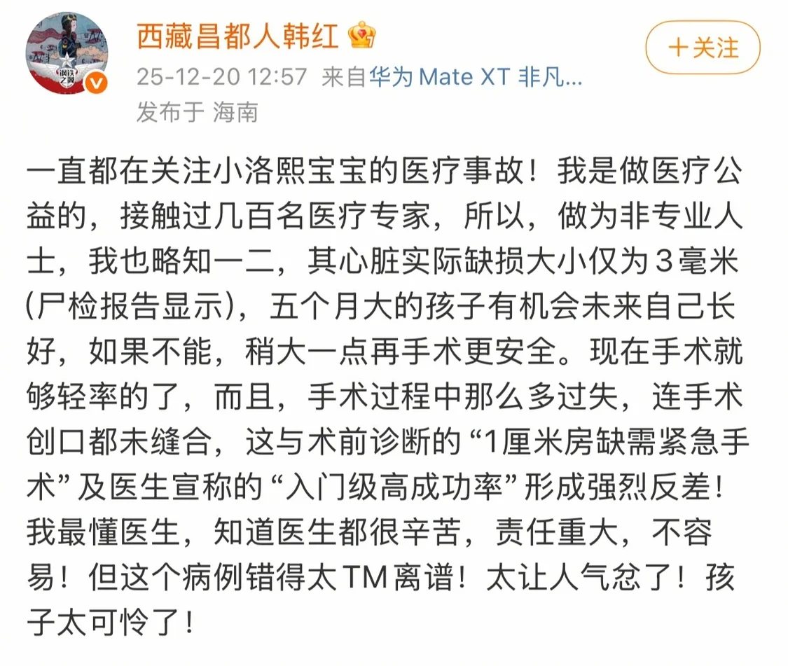 2025年11月14日,5月龄早产儿小洛熙在宁波大学附属妇女儿童医院接受心脏房间隔缺损手术时离世。 12月19日晚,许洛熙妈妈发布小洛熙尸检报告,其中提到“右侧第3至4肋间见长6.5cm的横行手术创口,未缝合”“心包右侧见长5.0cm的未缝合手术切口”“冠状窦口可见,但未见异常”“房间隔缺损大小为1.0cmX0.9cm”。 12月20日,@西藏昌都人韩红 发文:这个病例错得太离谱!