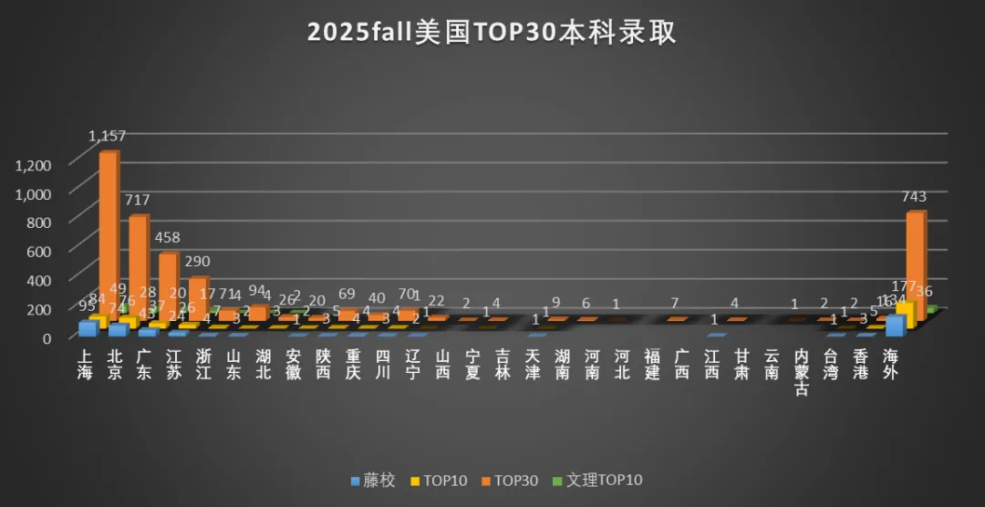 往年我们都说offer总数上海占据优势,但顶尖名校录取北京更胜一筹,今年上海终于反超北京,藤校+TOP10+文理学院总数上海207枚,北京151枚,广东94枚。