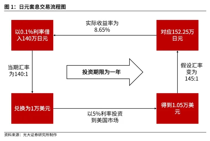 说白了,就是一种简单的理财手段:借入便宜的日元后,兑换成美元,购买收益率更高的美元(5%),从中赚取收益。