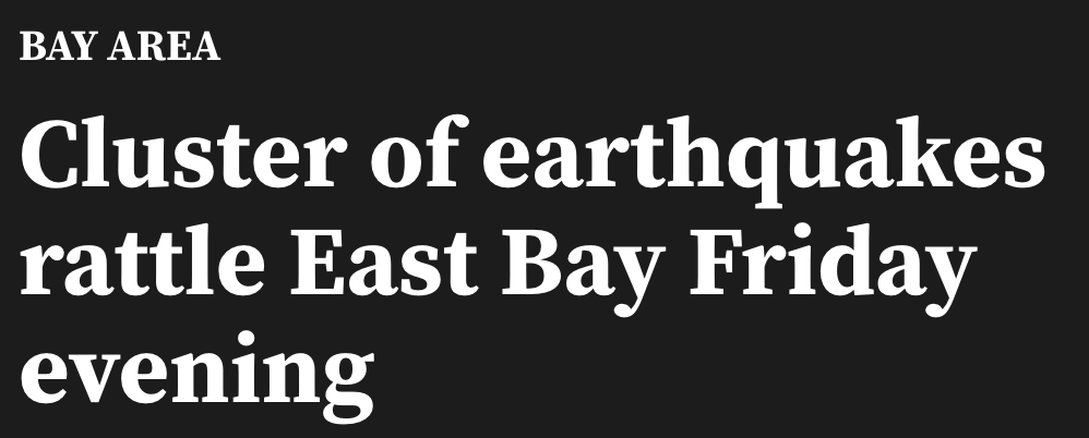周五(19日)凌晨,加州东湾地区在数小时内接连发生6次地震,震级分别从2.9级至4.0级。美国地质调查局确认,震中位于康特拉科斯塔县、靠近核桃溪一带。目前暂无人员伤亡报告,但连续地震仍引发广泛关注。 地震发生后,东湾社交平台被接连地震信息迅速刷屏。“你们那边也震了吗?”“我家吊灯晃得厉害!”类似消息不断出现。