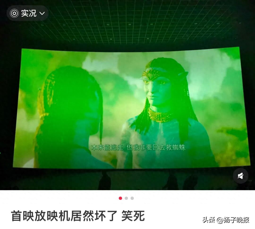 《阿凡达3》昨天正式上映,多地网友在社交平台上配图发文称看《阿凡达3》时遭遇“放映机坏了”。记者看到,实况图上,有的大银幕背景成绿色的了,有的直接放不出,有的是模糊卡顿的。