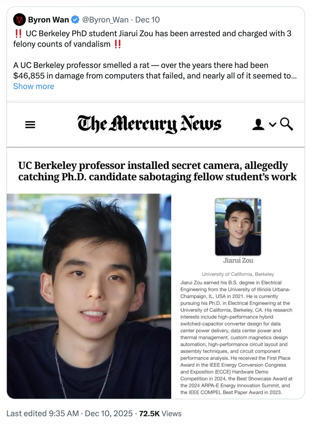 美国加州大学伯克利分校(UC Berkeley),这所全球理工科的“麦加圣地”,最近不再因为诺贝尔奖或重大科研突破霸榜,而是因为一桩极度抓马、极度离奇、又极度令人唏嘘的刑事案件,被推上了舆论的风口浪尖。