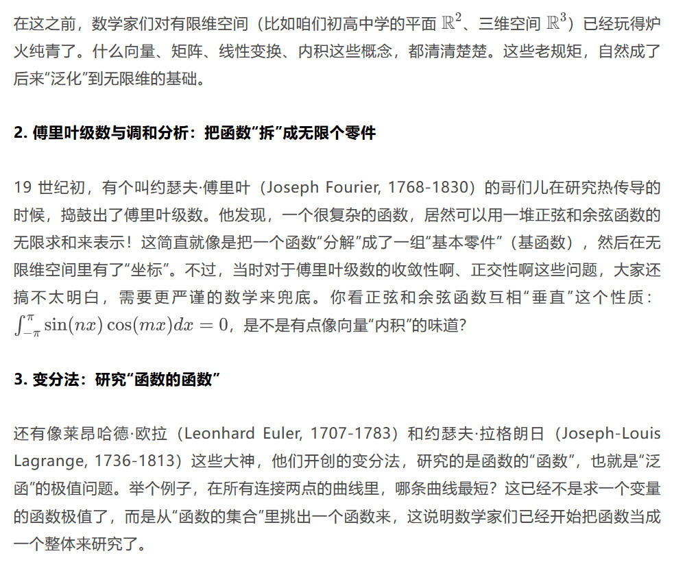19 世纪末 20 世纪初,数学家们开始发现,光靠有限维的工具已经不够用了。他们遇到了一系列特别棘手的问题,这些问题都隐隐约约指向了一个共同的方向:得想办法处理那些“无限维度”的东西,比如函数或者无穷数列。