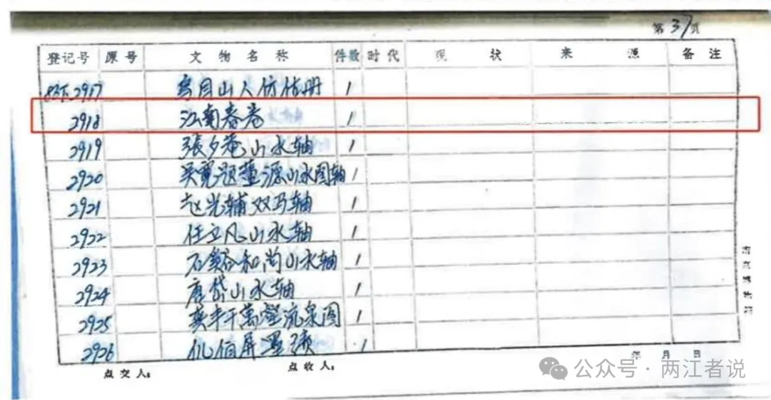 记者经采访得到了《江南春》图卷从划拨、调剂、退藏、销售的相关史料。1986年6月,原文化部制定出台《博物馆藏品管理办法》。之后,南京博物院依照此办法,由原江苏省文物出境鉴定组及南博鉴定人员对一批建议剔除的书画作品进行再次审核,确认不宜入藏。1997年4月15日,南京博物院向原江苏省文化厅提交《关于处理不够馆藏标准文物的报告》,请求“将不够馆藏标准的文物(即博物馆的处理品)进行调剂,价拨给省文物总店处理”。原江苏省文化厅于1997年4月21日同意调剂。1997年5月8日,被专家认定为赝品的《江南春》图卷拨交给原江苏省文物总店,于2001年4月16日被“顾客”以6800元价格购买,销售清单明示为《仿仇英山水卷》。