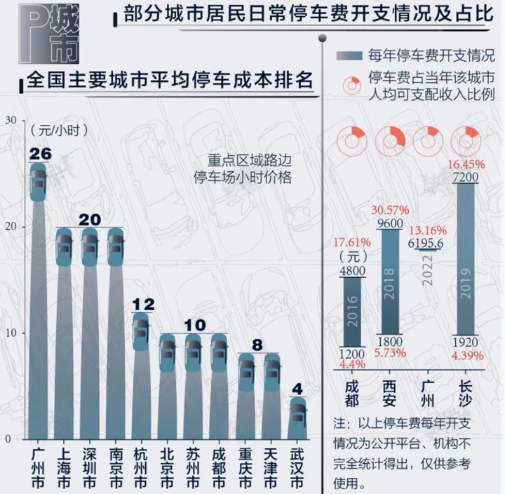 长期以来,广州的停车费一直居高不下。几年前,界面新闻曾做过一项统计,广州重点区域路边停车场的平均成本高达 26 元/小时,这一数据在全国遥遥领先。作为对比,同为一线城市的上海、深圳约为 20 元/小时,北京仅为 10 元/小时,而新一线城市武汉的 4 元/小时甚至排到了全国第十一名。