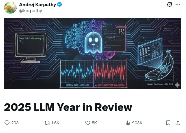 AI 大牛 karpathy 发文回顾了 2025 年的大语言模型。