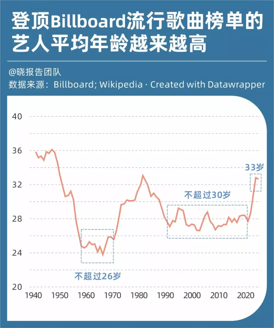 音乐人兼学者达拉·里瓦在研究了80年来的Billboard最热歌曲榜单后发现,登顶歌手的平均年龄持续走高,最近三年(2022—2024年)里已经达到33岁。