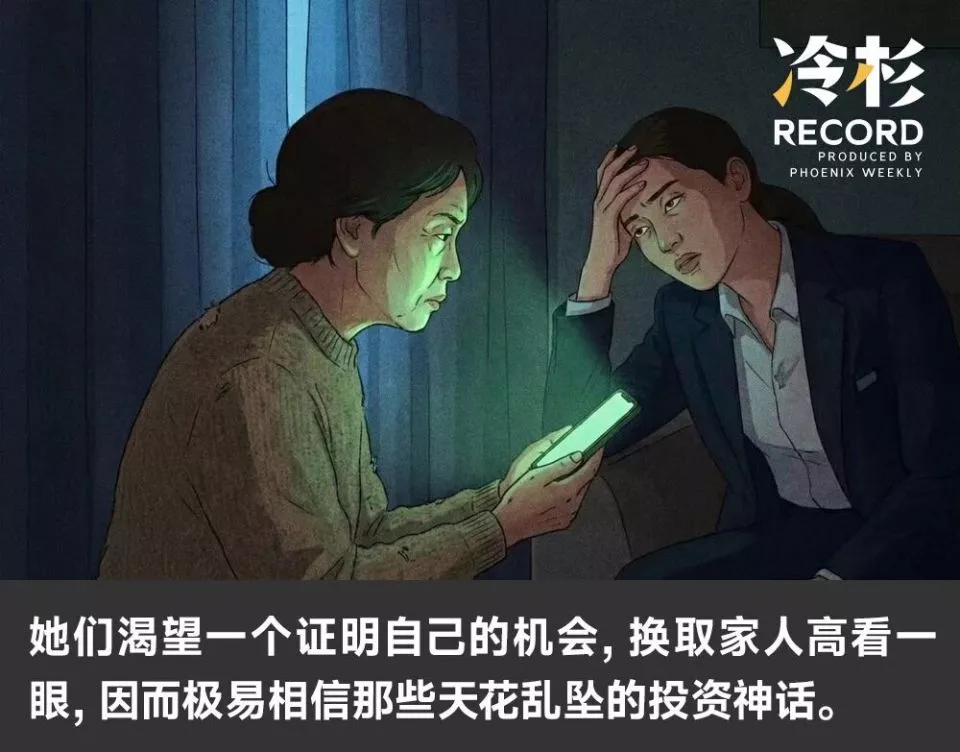 范君认识在那起黄金诈骗案中,与王季一同受骗的邻居老太太。她们年纪相仿,人生经历也相似:长期在家相夫教子,没有自己的事业,经济上要依赖丈夫和孩子。她们渴望一个证明自己的机会,换取家人高看一眼,因而极易相信那些天花乱坠的投资神话。